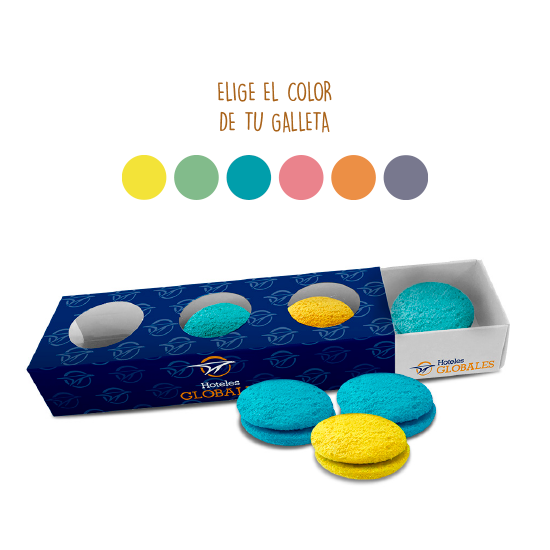 Personalization: Customizable cardboard box from 1 to 4 colors.-Cookie colors: blue, green, orange, pink, yellow or purple. Other colors to consult.-Flavor: butter and chocolate.