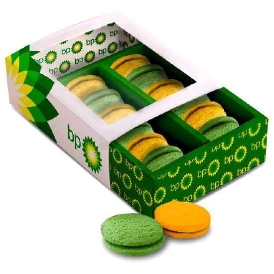 Description: personalized box filled with 2, 3, 4, 5, 6, 7, 8, 9, 10, 11 or 12 double chocolate-filled cookies in a varied range of colors, ideal to represent the colors of your company.