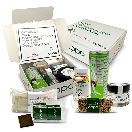 Description: ideal kit to boost energy in your daily life consisting of an apple and melon energy drink (250ml), an energy bar (chocolate and hazelnuts), a pill bottle (jelly beans), a bottle with 100g of mixed nuts, a sandwich (ham and cheese) and a bag with 5 chocolate bars. All presented in a cardboard box.