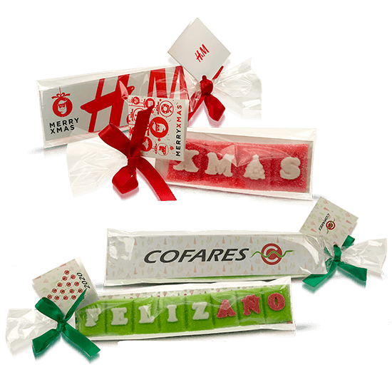 Description: compose your text (4 letters: 130x55x5 mm – 8 letters: 220x55x5 mm) of fruity flavors between 4-8 letters, presented in a bag and closed with a bow and banner.
