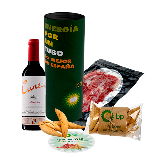 Description: 50g of Iberian ham accompanied with a bag of picos and a 37.5cl bottle of Rioja Crianza. Presented in a cardboard tube.