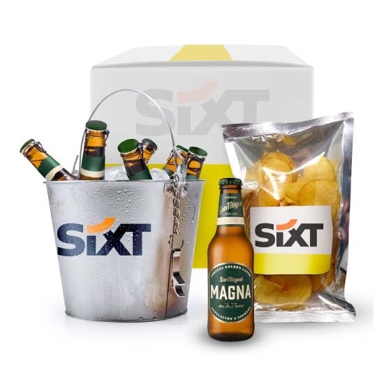 Description: metal bucket with opener + 6 beers (brand to choose from among those from the Mahou San Miguel Group) + bag of 100% natural artisanal chips.