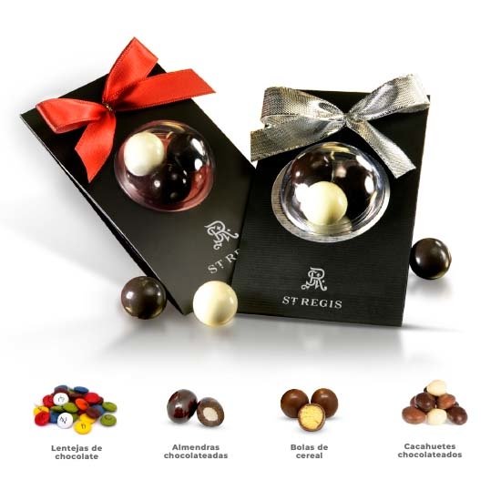 Description: die-cut cardboard cover that holds a semisphere filled with chocolates of your choice.