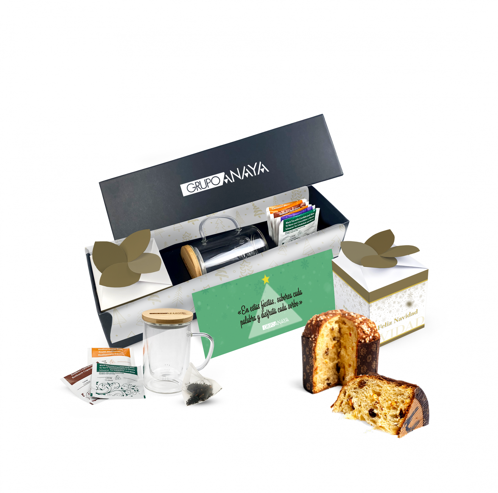 Description : boîte rigide en carton (430×110×110 mm) comprenant une carte personnalisée, un panettone (350 g), une tasse avec infuseur, et un assortiment de 6 sachets de thé.