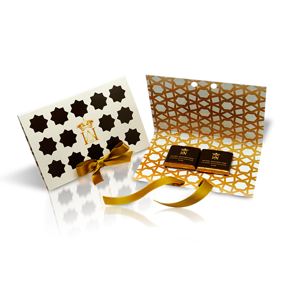 Description : carte postale en carton de 2 délicieuses napolitaines en chocolat pur ou au lait, fermées par un noeud et du papier sulfurisé.