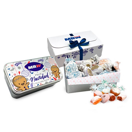 Description : coffre (180x98x58 mm environ) avec assortiment de Noël « premium » (250g environ) présenté dans une écharpe et un nœud.