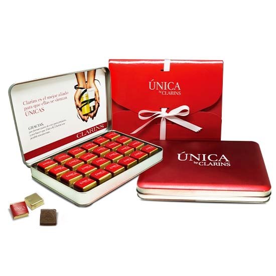 Description : boîte en acier contenant 24 créminos 100% noisettes. Présenté dans une pochette cartonnée avec un nœud.