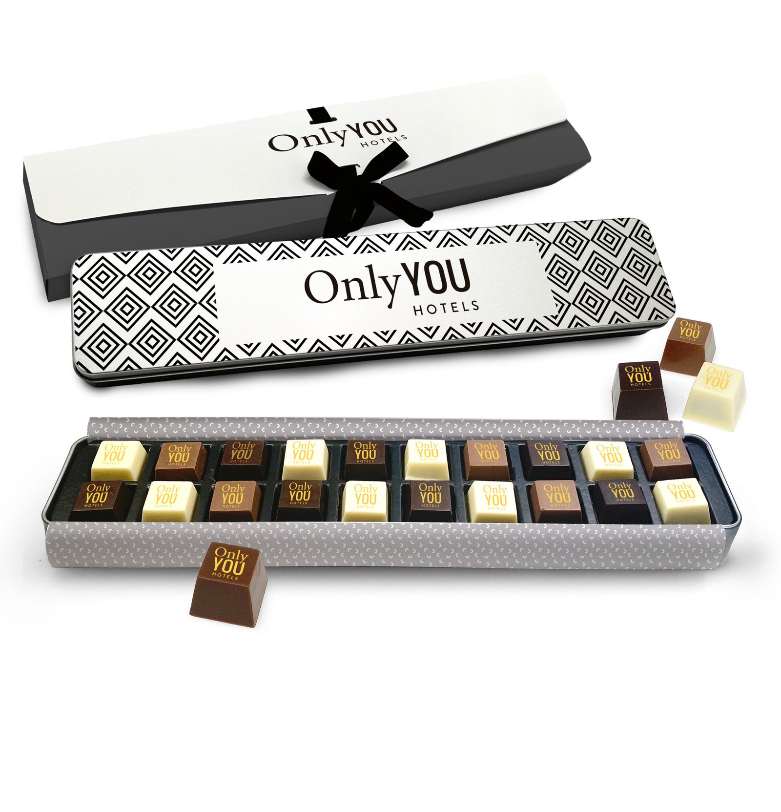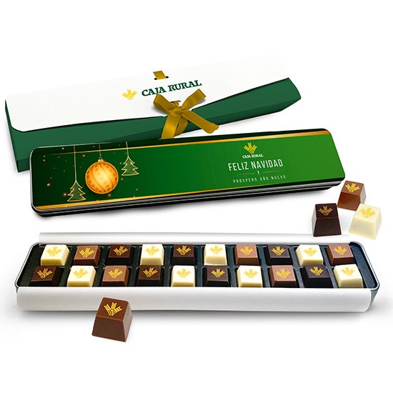 Description : boîte métallique (346x70x27 mm) contenant 24 chocolats pyramidaux. Présenté dans un écrin fermé avec un noeud et une carte de vœux. Possibilité de substitution par des chocolats artisanaux