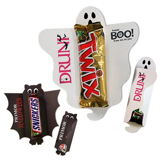 Description : triptyque découpé à l’emporte-pièce avec des personnages d’Halloween (40×110 mm) contenant une tablette de chocolat.