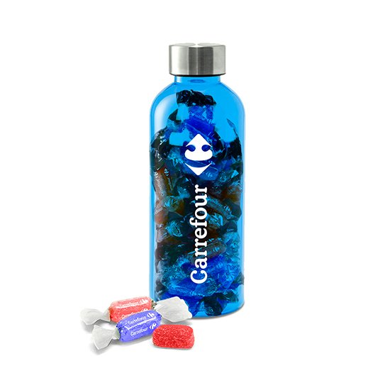 Descripción: bidón transparente de 600ml y de alta resistencia al calor con tapón a rosca en acero inoxidable. Disponible en variada gama de colores. Con caramelos a elegir (40 uds. aprox.).