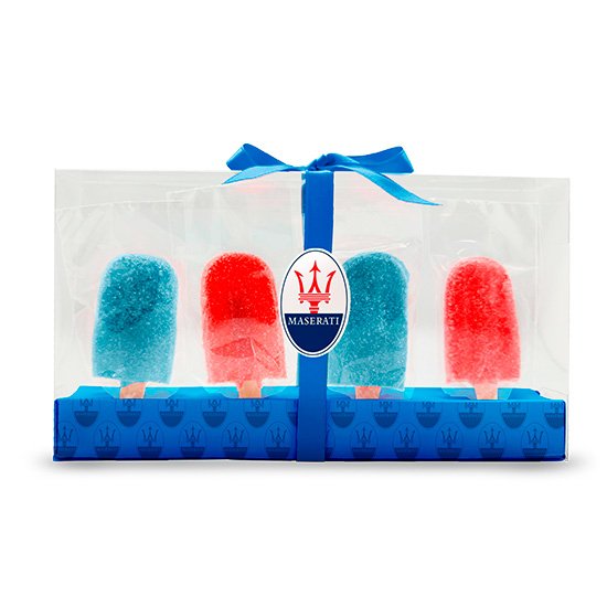 Descripción: caja de acetato (220x125x28 mm), contiene 4 polos de gominola con sabores frutales personalizando los colores según tu marca.