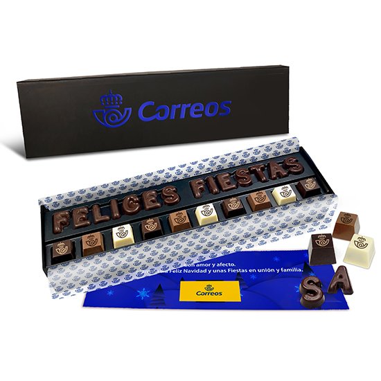 Descripción: caja de cartón duro forrado (335x95x55mm) con texto de «Felices Fiestas» en chocolate y 10 bombones pirámide de 3 sabores. Contiene tarjetón de felicitación.