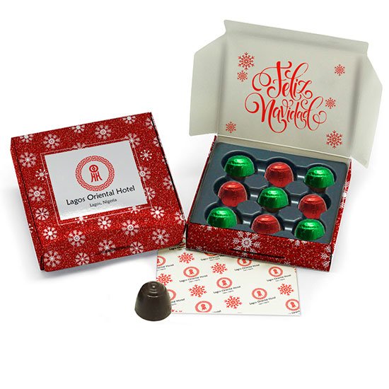 Personalización: caja y papel vegetal personalizables de 1 a 4 colores. Posibilidad de elegir el color del envoltorio de los bombones entre: verde, azul, rojo, plata y oro (color estándar). a consultar disponibilidad de los colores de los bombones.