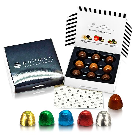 Descripción: caja de cartón folding o kraft (98x87x25 mm) con 9 mini bombones tesais de 3 sabores.