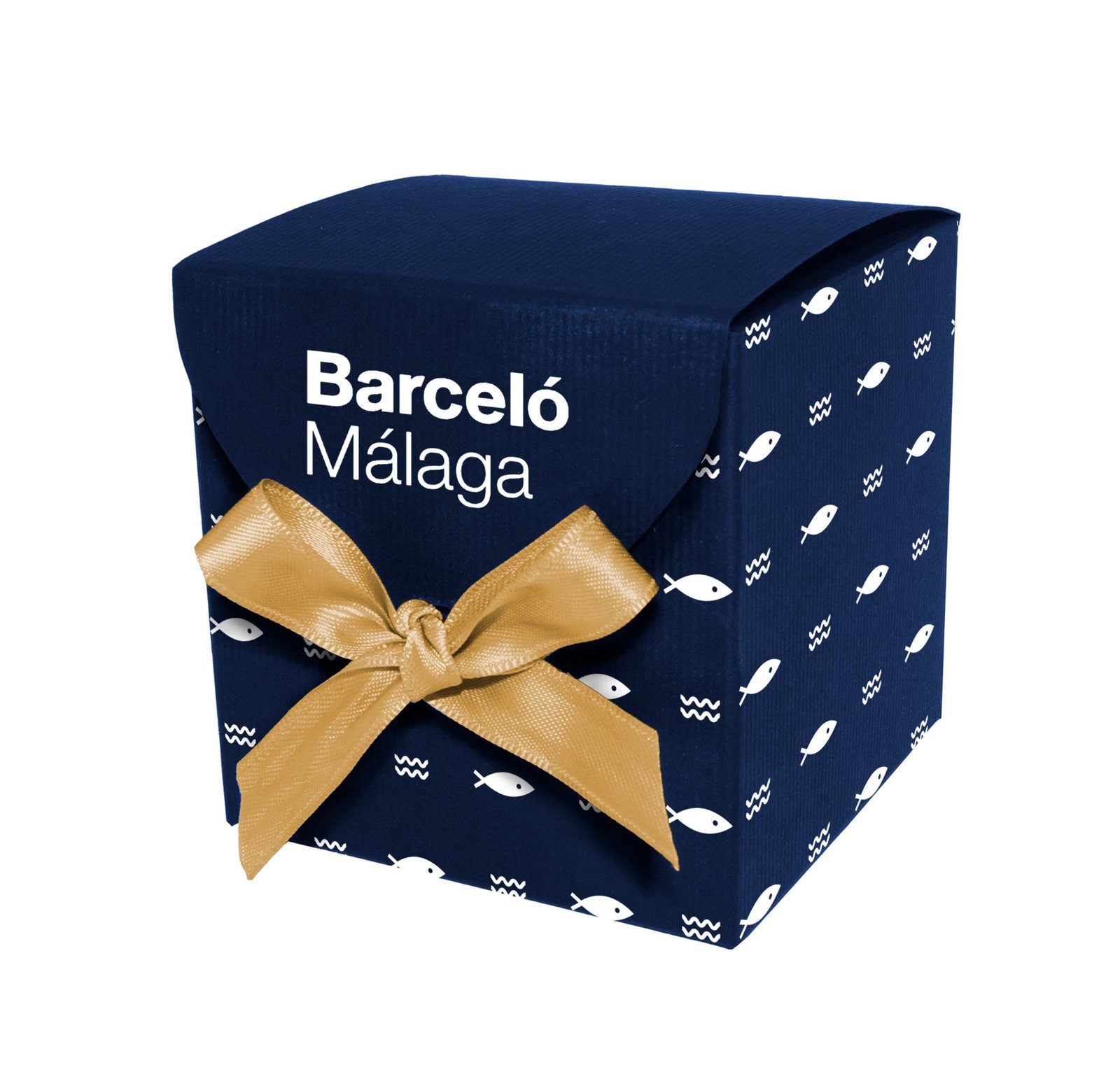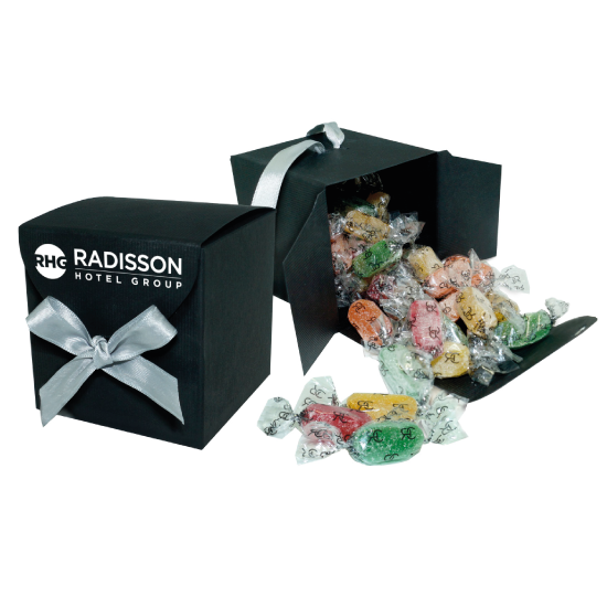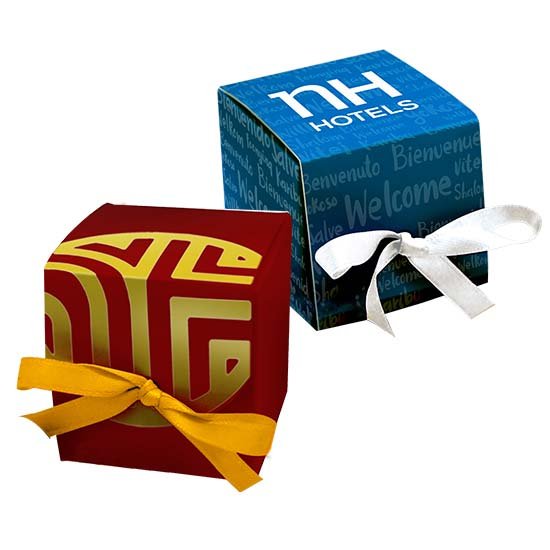 Descripción: cubo de cartón (80x80x80 mm) cerrado con lazo con 25 caramelos aprox. tipo pectina u otro tipo de caramelo.