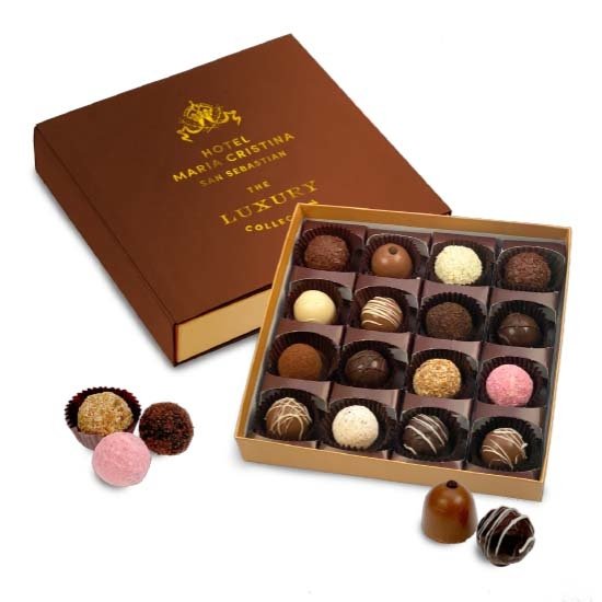 Descripción: caja NO PLASTIC rellena de 16 trufas de chocolate belga.