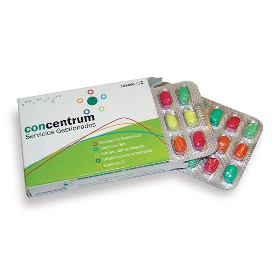 Descripción: caja (97x65x20 mm) con 2 blíster de 18 caramelos (36 caramelos en total), de sabores a elegir: menta, fruta, mezcla de sabores.