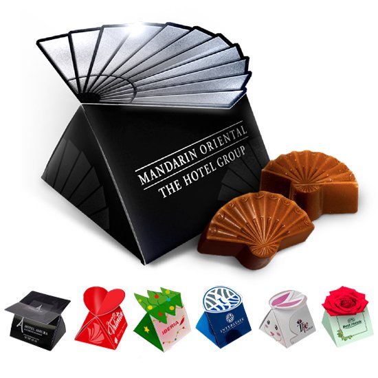 Personalización: solapa troquelable con la forma que quieras (por ejemplo: logotipo, icono regional, festividad, etc). Se pueden personalizar las envueltas, según bombón elegido con un patrón, o bien hacer tu diseño de bombón en 2D.