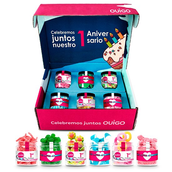 Descripción: caja de cartón (430x110x220 mm aprox.) con 6 botes rellenos de gummies premium.