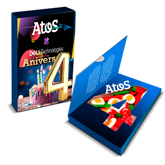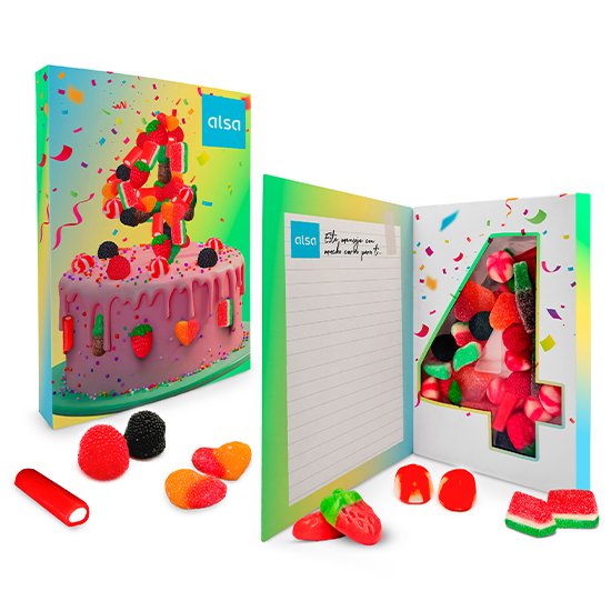 Descripción: caja libro folding (210x148x22 mm) con bandeja en el interior con el número que escojas. Rellena de surtido de chuches a elegir.