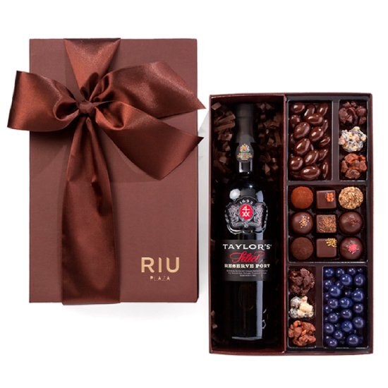 Descripción: caja de cartón en formato regalo rellena con una botella de vino, almendras chocolateadas, 6 rocas de chocolate, 9 bombones artesanos y bolas de cereal.