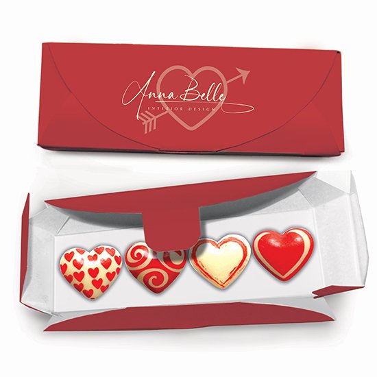 Descripción: caja slim con 4 bombones en forma de corazón. Posibilidad de elegir otros rellenos.