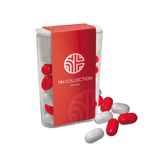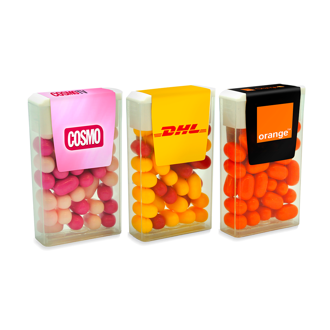 Descripción: caja dispensadora pudiendo escoger los caramelos con los colores de tu empresa.