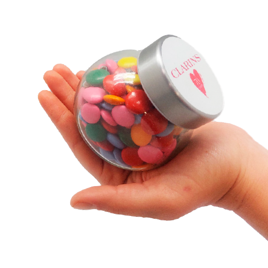 Descripción: caramelera de cristal (69×78 mm) con tapa de acero con 40g de surtido de caramelos con posibilidad de elegir otros rellenos.
