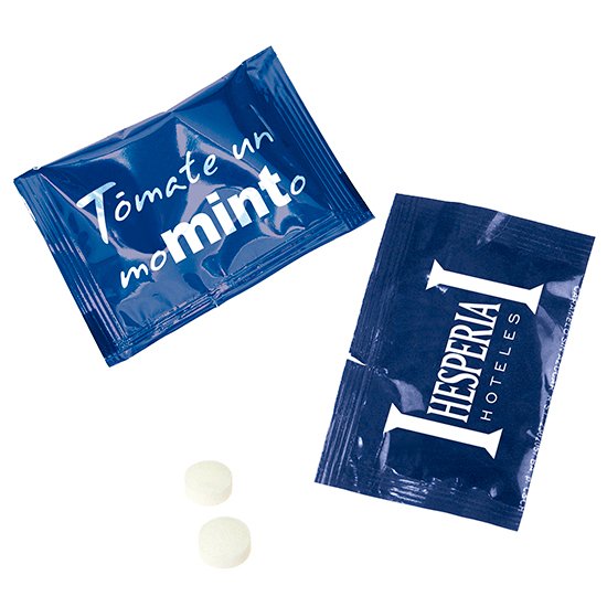 Descripción: caramelos comprimidos de menta sin azúcar en envase flow-pack (50×35 mm).