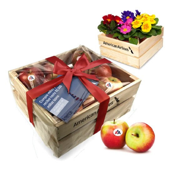 Descripción: caja de madera rellena con manzanas frescas, cerrada con lazo.
