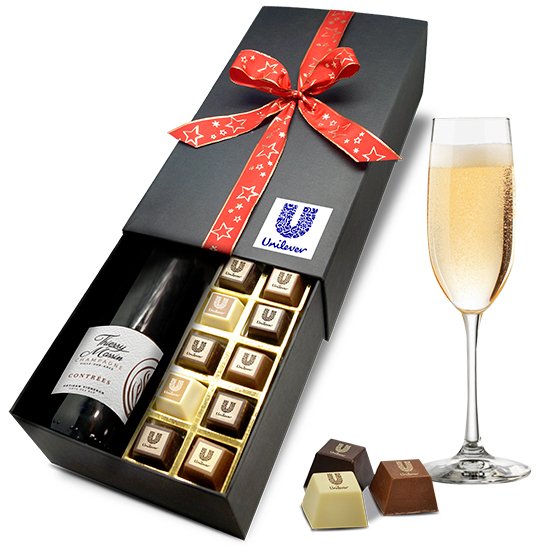 Descripción: caja de cartón duro forrado que contien16 bombones pirámide artesanos y una 1 botella de champagne.