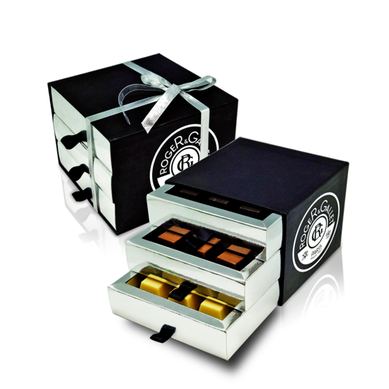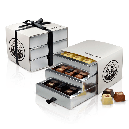 Descripción: caja cubo de cartón (130x130x100 mm) con tres bandejas rellenas con 9 bombones pirámide en cada bandeja. Sabores disponibles: chocolate negro, blanco o con leche, relleno de praliné. Contiene 27 bombones pirámide.