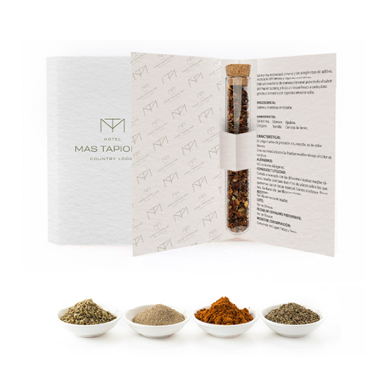 Descripción: frasquito de especias en una amplia gama de opciones para que escojas las de tu región. Presentado en un díptico personalizable con el logo e información del hotel.