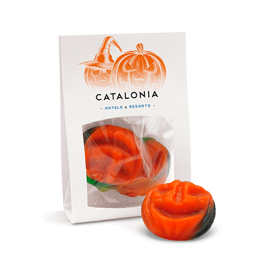 Descripción: fajín de cartón (80x50x20 mm aprox.) rellena con calabazas de gominola.