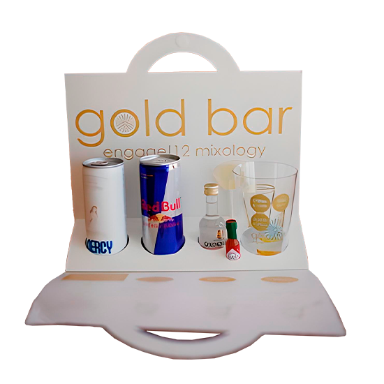 Descripción: soporte de cartón tipo maletín para transportar los mejores cócteles.