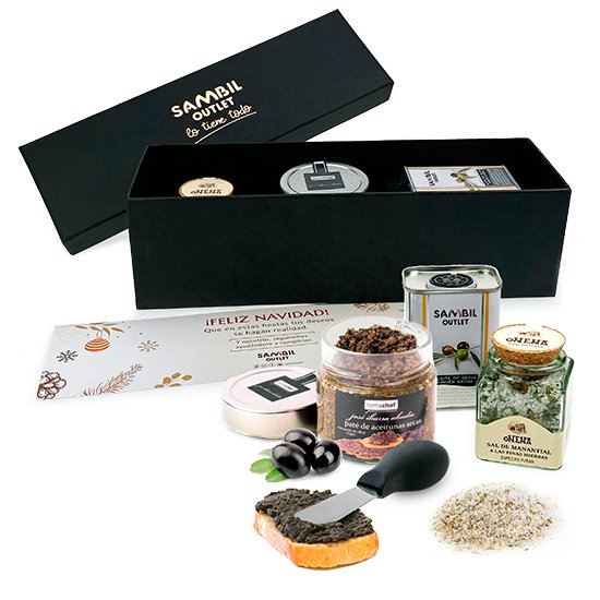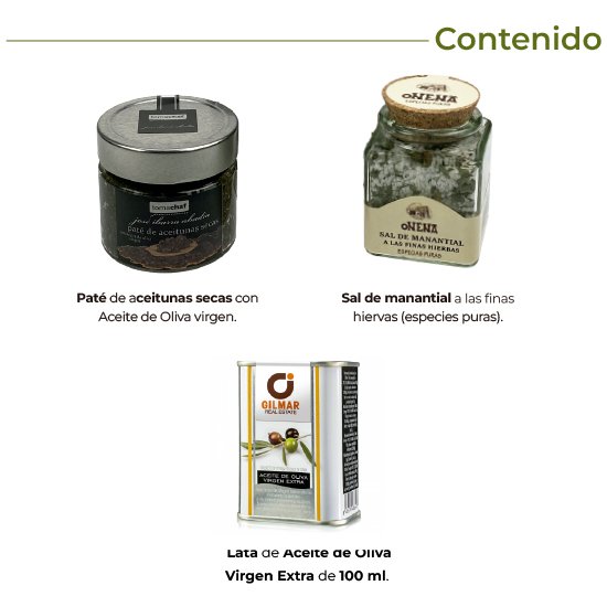 Descripción: kit de productos mediterráneos: aceite de oliva (100 ml), paté de aceitunas y sal en escamas. Con tarjeta de felicitación personalizada. Presentado en caja de cartón duro forrado (335x85x87 mm).