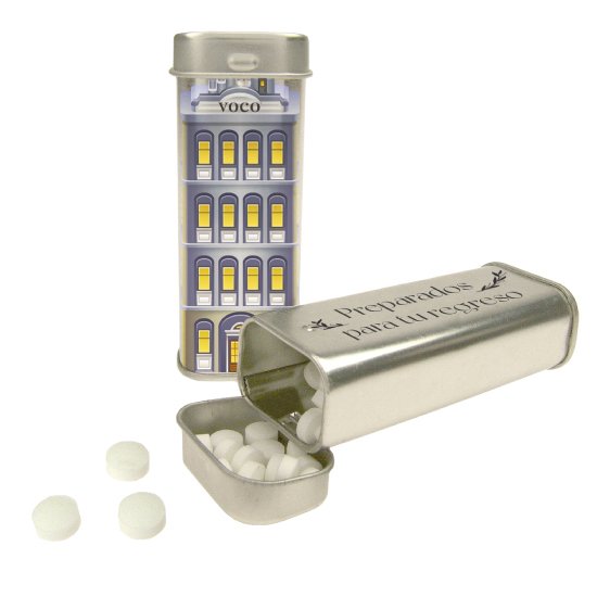 Descripción: lata bisagra de acero (32x22x80 mm) con caramelos a elegir.