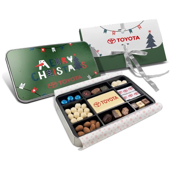 Descripción: elige tu composición desde 5 a 9 rellenos a elegir entre bombones tesais, catanias con cacao, bombones artesanos, tableta de chocolate con tu logo, 6 creminos, bombones pirámide, catanias de chocolate blanco con sal y bolas con chocolate blanco.