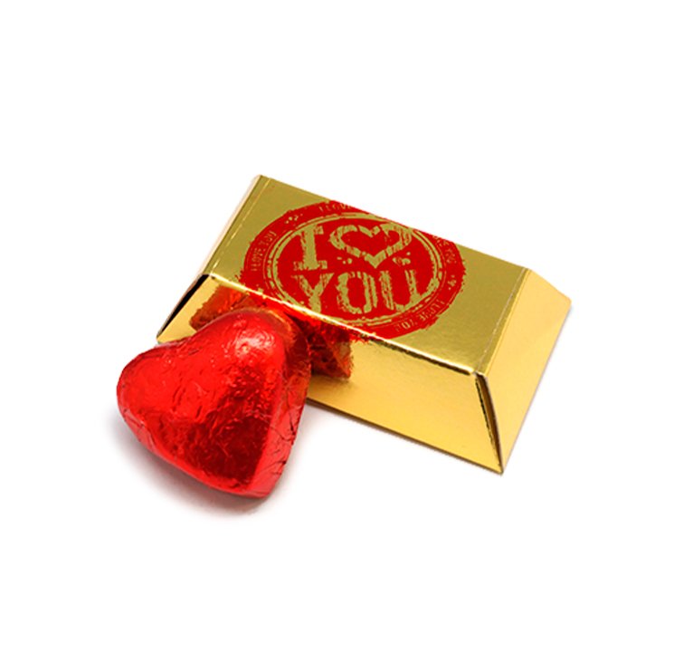 Descripción: lingote pequeño de cartón (70x40x20 mm) en color oro con 2 con cortados de chocolate.