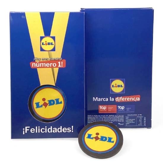 Descripción: cajacon medalla de chocolate personalizada con diseño a medida.
