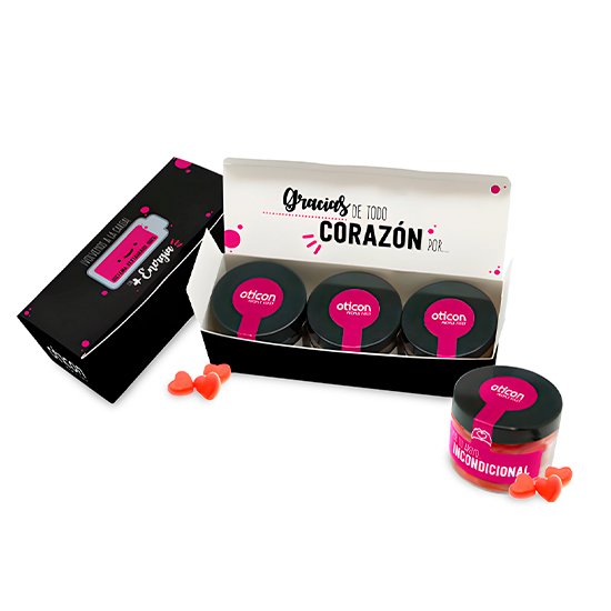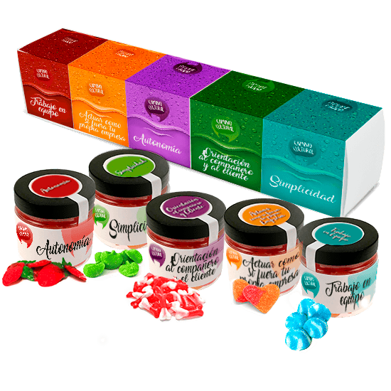Descripción: caja folding con 2 a 5 botes de 150 ml con caramelos de goma a elegir.