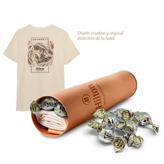 Descripción: Este pack, se compone de una camiseta de calidad premium con diseño adaptado a tu idea de comunicación. Nuestro departamento de diseño está a tu servicio para crear una camiseta única. Se acompaña de 5 bombones 2 lazos y se presenta en tubo de cartón.