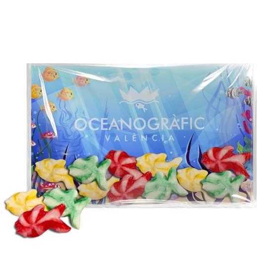 Descripción: bolsa celofán con cartón de diseño de pecera, con 40/20g de caramelos gummy en forma de peces.