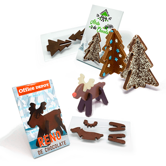 Descripción: reno o abeto de chocolate en puzzle. Presentados en caja (100x170x10 mm).