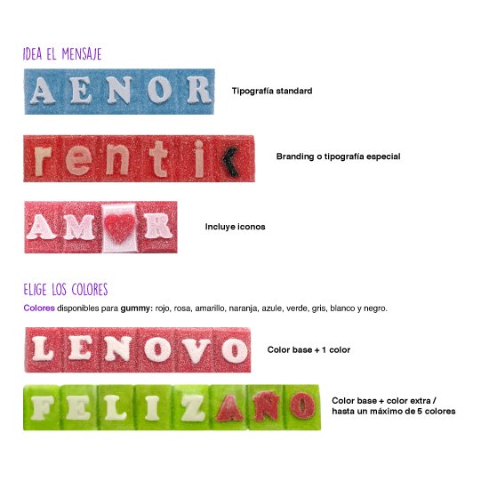 Descripción: permite crear el mensaje de 2 a 11 letras de gominola para: messaging,branding, promoción, eventos (peso aproximado 10g por onza. Medida onza 35x25x10 mm aprox.)
