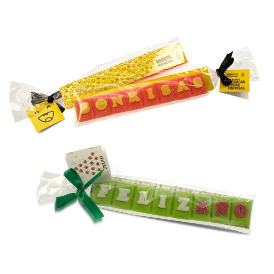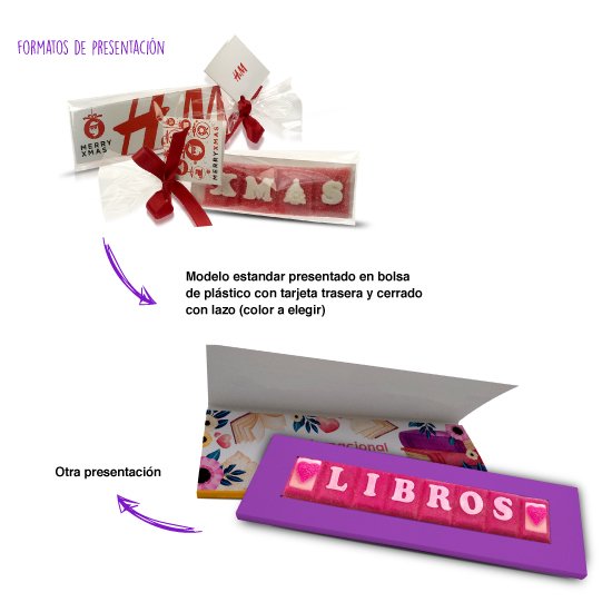 Personalización: letras personalizables (mensaje, color, sabor), cartela personalizable a todo color, cartoncillo personalizable de 1 a 4 colores. Se puede escoger el color del lazo y el formato de presentación. Modelo estándar presentado en bolsa de plástico con tarjeta trasera y cerrado con lazo. Presentaciones opcionales: formato postal personalizada con papel vegetal y cerrada con lazo, o caja tipo folding.